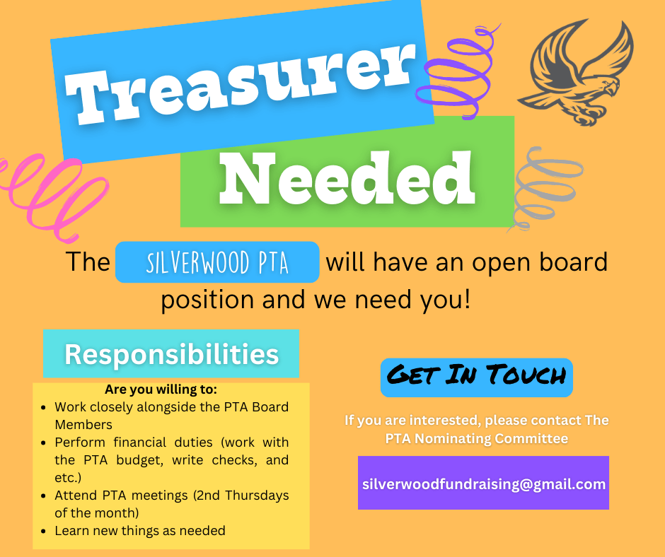 We need someone that is financially savvy or willing to learn (the Treasurer will be responsible for PTA tax filings, permits, insurance, and etc.), has flexibility and availability to collect and count monies from events/fundraisers, and have a sense of humor!