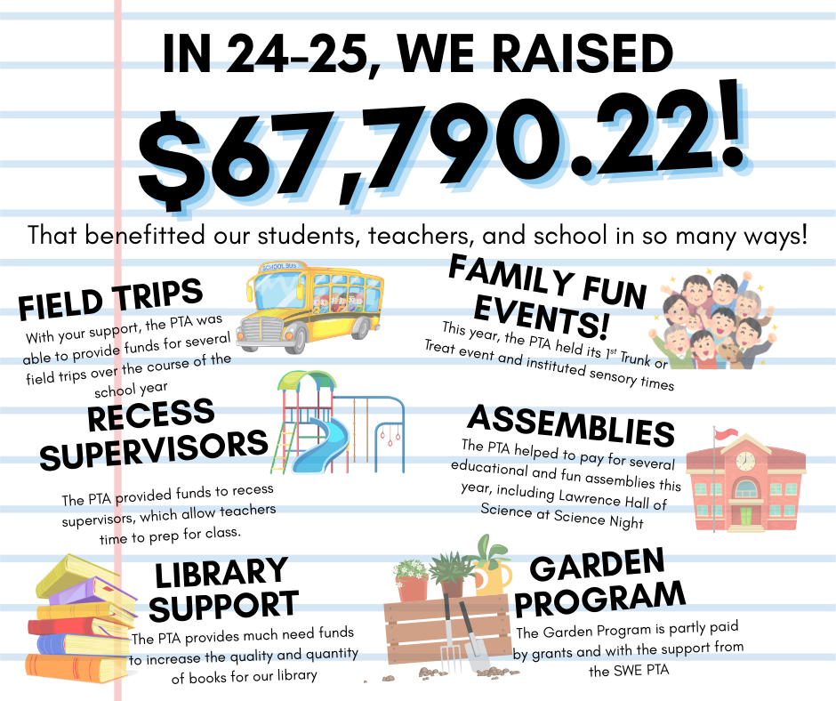 Thanks to your time, energy, and generosity, the PTA raised over $67,000 for programs that directly benefit our students — including the garden program, school assemblies, recess supervisors, and field trip support.