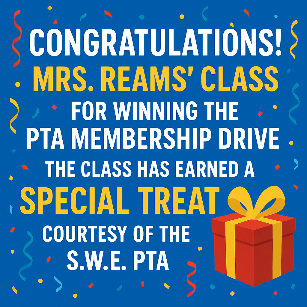 Because of their outstanding participation, Mrs. Reams’ class has earned a special treat, courtesy of the S.W.E. PTA!
