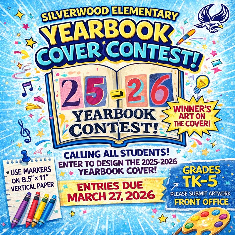 The winning design will be selected and featured on the official 2025–2026 Silverwood Elementary Yearbook cover—a fun and memorable way for students to leave their creative mark on this school year!